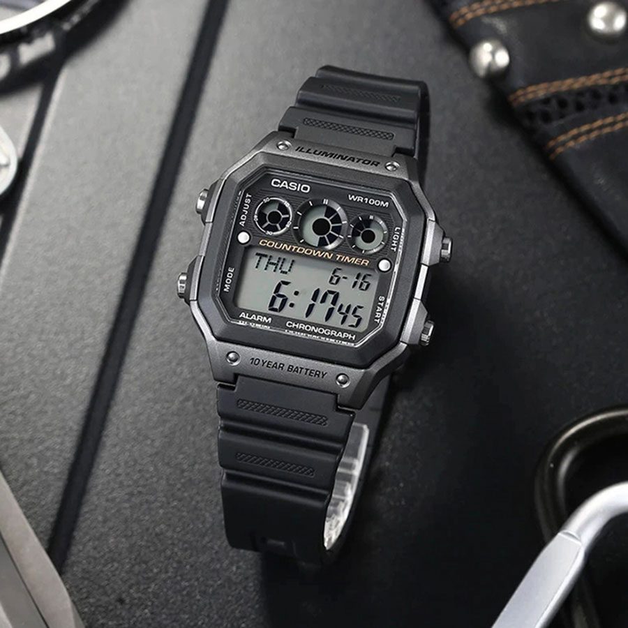 یک ساعت دیجیتال اسپرت با صفحه نمایش خاکستری، ae1300 بدنه و بند رزینی مقاوم و طراحی کاربردی است که با برخورداری از تایمر حرفهای، کرنومتر دقیق، نمایش ساعت جهانی و نور پسزمینه، انتخابی ایدهآل برای ورزشکاران، داوران و افرادی است که به دنبال ساعتی سبک، بادوام و مناسب استفاده روزمره هستند